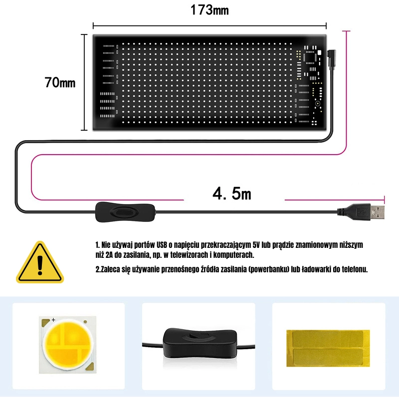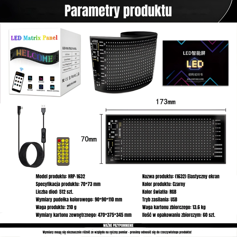 Matryca LED 16x32 Pixel – Bluetooth, pilot zdalnego sterowania, 512 diod, USB