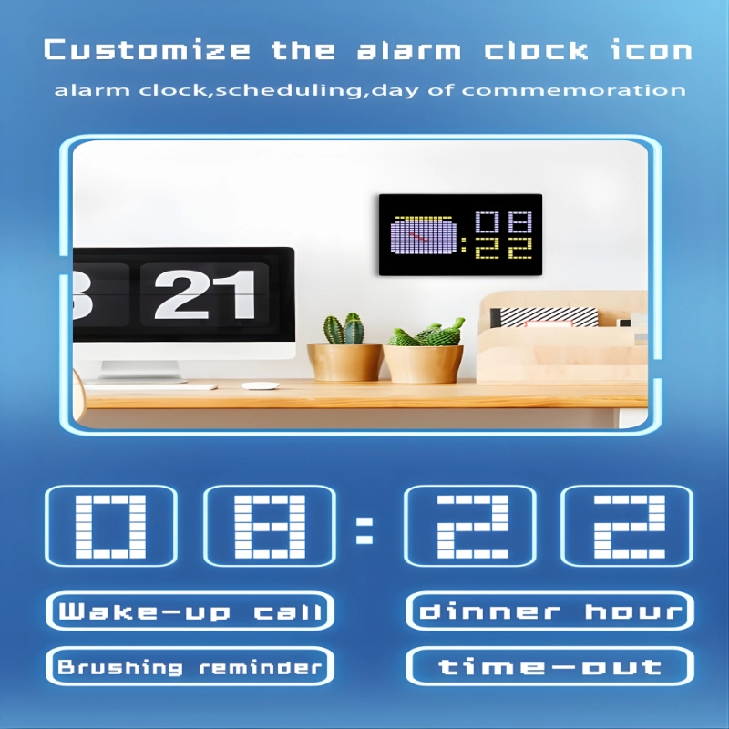 - Edytor tekstu i budzik – wyświetlaj wiadomości, godzinę i ustawiaj alarmy